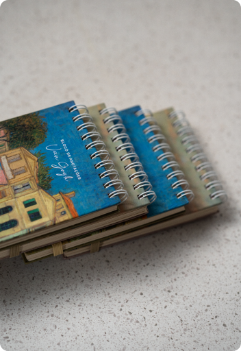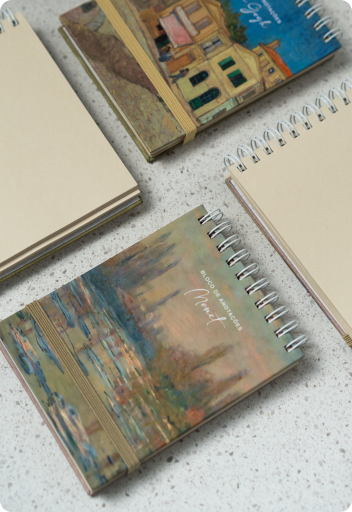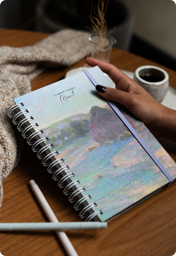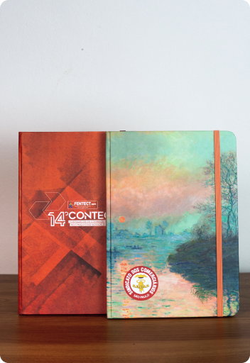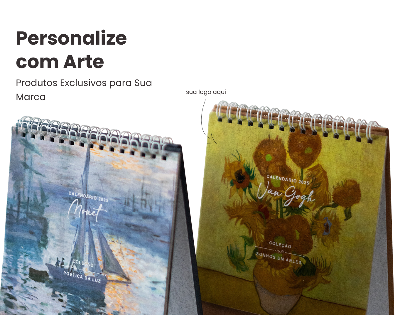 Agendas Artísticas: Personalize a capa com o logotipo ou arte completa e adicione páginas extras para destacar informações da sua marca.