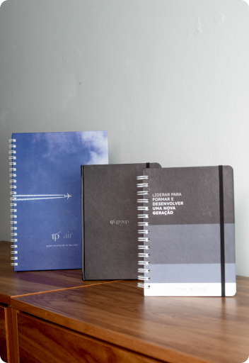 Cadernos: Personalização completa da capa e miolo, oferecendo uma solução versátil e elegante para promover sua empresa.