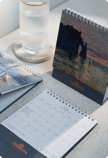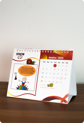 Calendários de Mesa: Organizam o ano e decoram o espaço de trabalho com personalização artística ou corporativa, incluindo datas e informações relevantes.