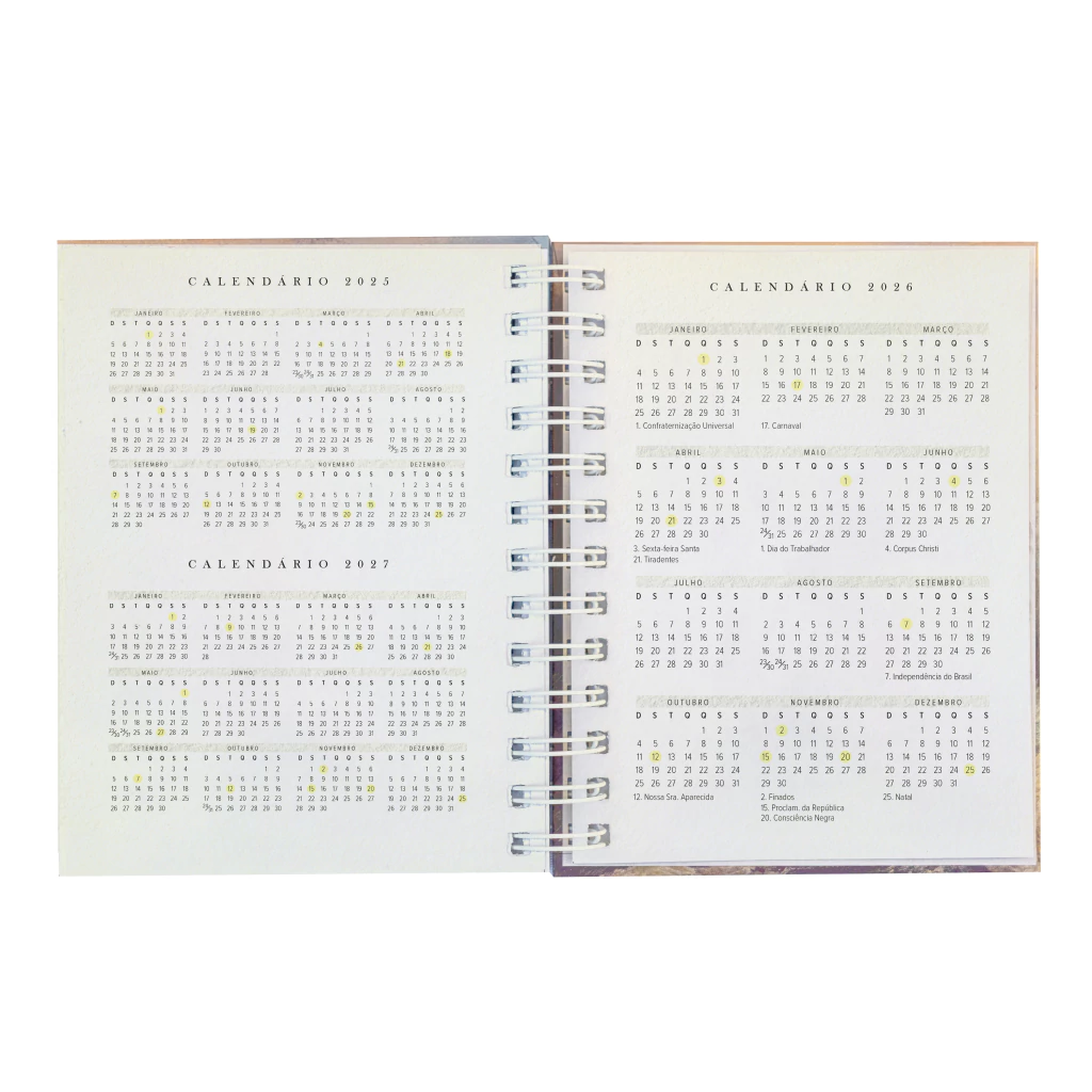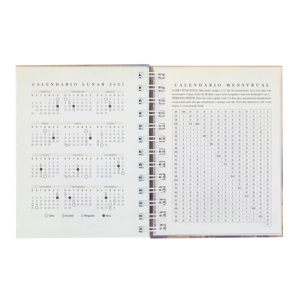 Nossa agenda possui uma página para cada dia, além de organizadores como planner mensal, controle de livros lidos e filmes assistidos, calendários lunar e menstrual, uma bolsa ecológica de papel dupla no início da agenda e anel duplo em metal para fechamento. Não utilizamos nenhum tipo de plástico na fabricação.