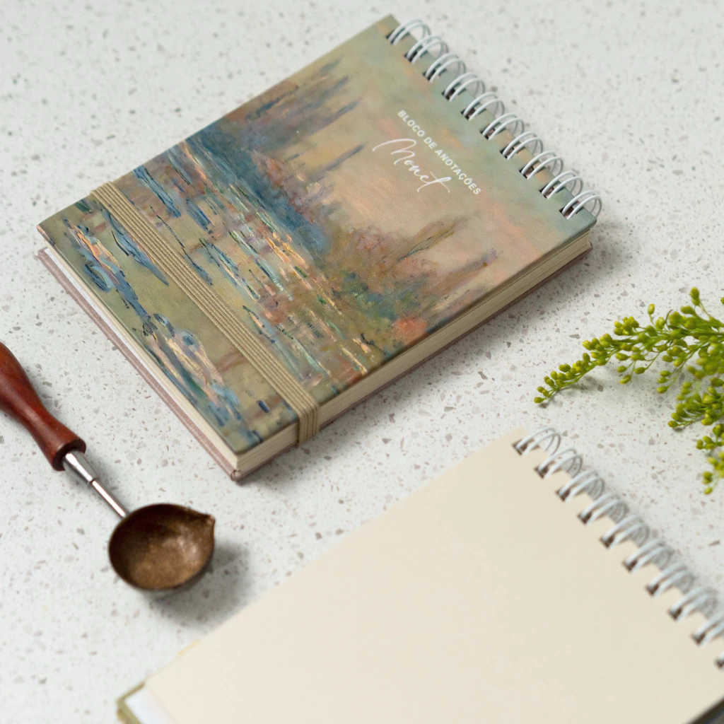 A pintura da capa chama-se “Gelo Flutuante no Sena”, do artista Claude Monet, e foi produzida em 1880. Ela é parte da coleção “Poética da Luz” que inauguramos para a coleção de 2025 com ideia de celebrar a habilidade do artista Claude Monet em capturar o efêmero da natureza, em especial o nascente e o poente, e sua paixão pela luz natural.