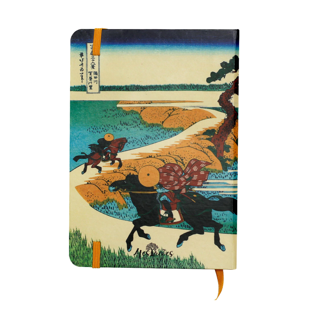 A obra “Vila Sekiya no Rio Sumida” do artista japonês Hokusai, pertence à sua famosa coleção “Trinta e Seis Vistas do Monte Fuji”, produzida em 1832. O miolo do caderno é sem pauta, e possui uma breve biografia do artista e um planner mensal no final do caderno.