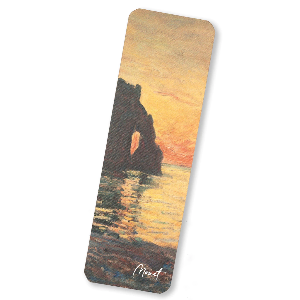 A pintura da frente chama-se “Etretat, Penhasco de d`Aval, Pôr-do-sol”, do artista Monet, e foi produzida em 1885.
