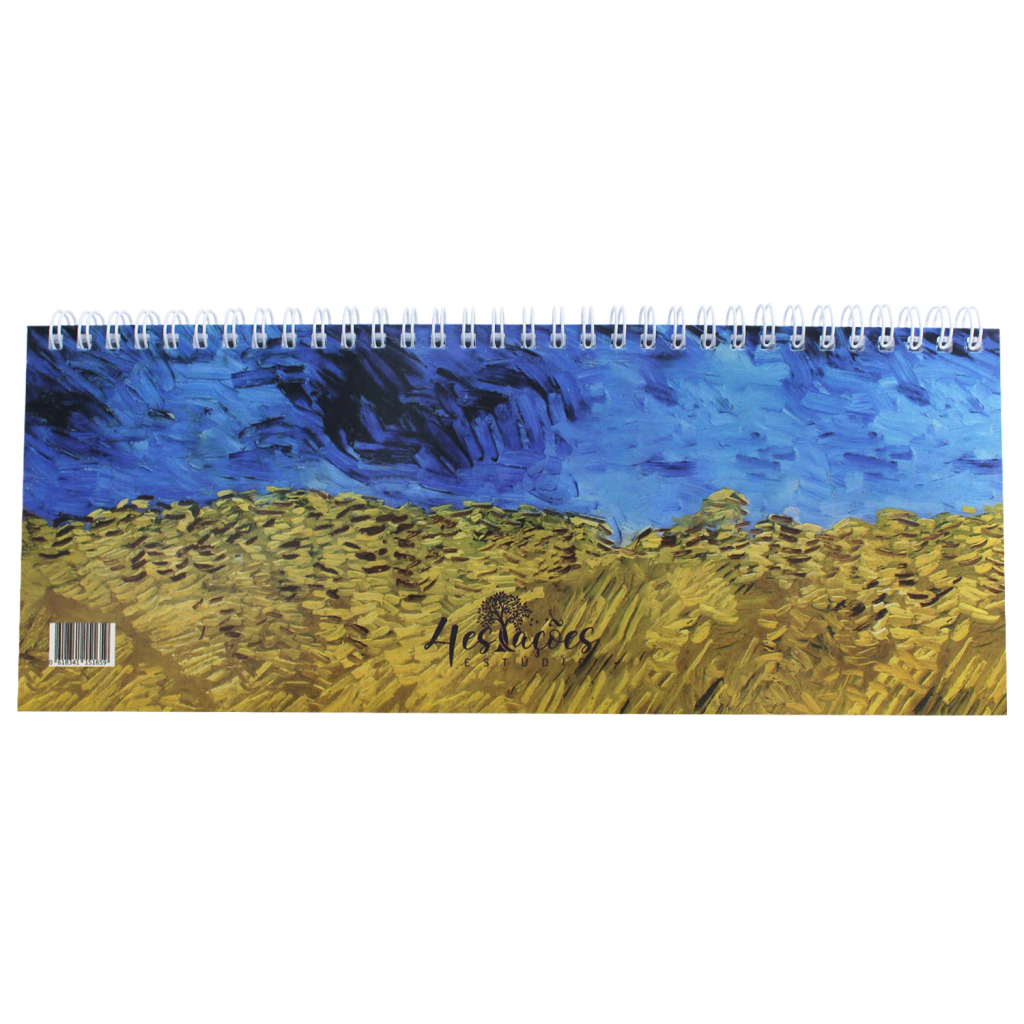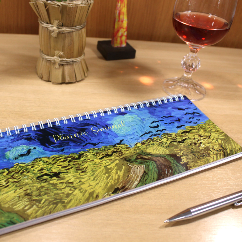 O Planner de mesa de Van Gogh é sem data e pode ser usado em qualquer época do ano. A obra "Campos de trigo com corvos" apresentada na capa, traz o uso das cores complementares no céu de azul intenso em Auvers, com o amarelo vivo dos campos de trigo aqui retratados, que combinam com as pinceladas fortes e dividem o campo visual. Aqui a linha do horizonte parece confusa, sem saídas e cria um ar de turbulência no espectador.